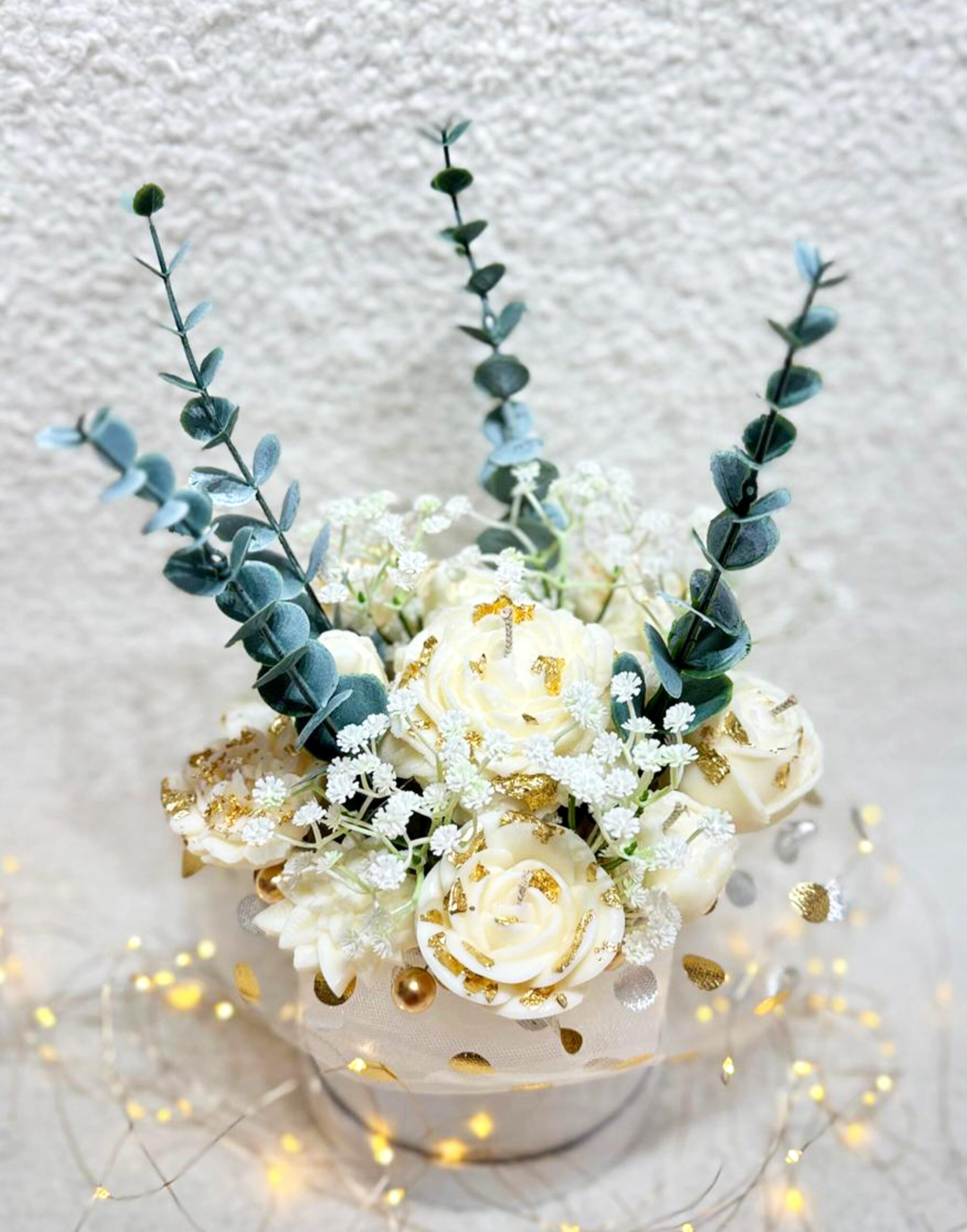 Aranjament floral de lux, realizat cu atentie la detalii si accente aurii rafinate. Un decor statement, potrivit pentru evenimente speciale sau pentru a oferi un cadou sofisticat care impresioneaza prin eleganta si stil.